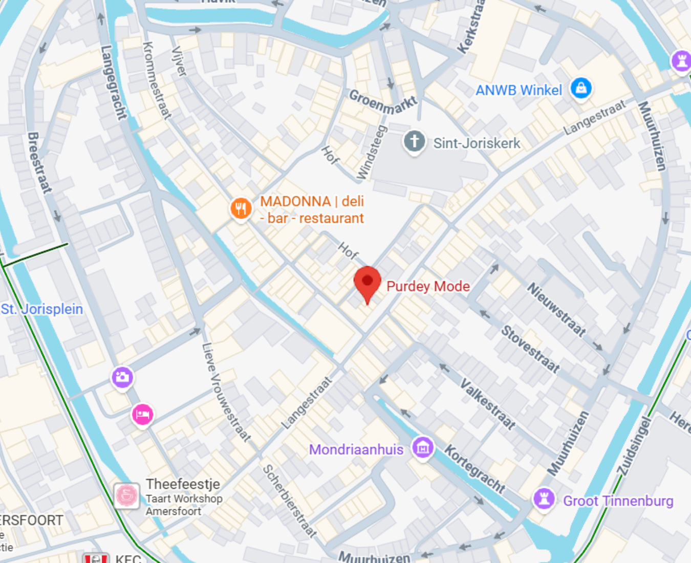 In het hart van de stad vindt u Purdey Amersfoort, gevestigd aan de Langestraat. Deze stijlvolle winkel staat bekend om haar duurzame en tijdloze collectie, ontworpen om eindeloos te combineren en geschikt voor iedere stijl. Van casual en comfortabel tot klassiek en elegant: bij Purdey vindt u mode voor elke gelegenheid. Wat uw stijl of moment ook is, Purdey biedt kleding die moeiteloos meebeweegt met uw dagelijks leven.