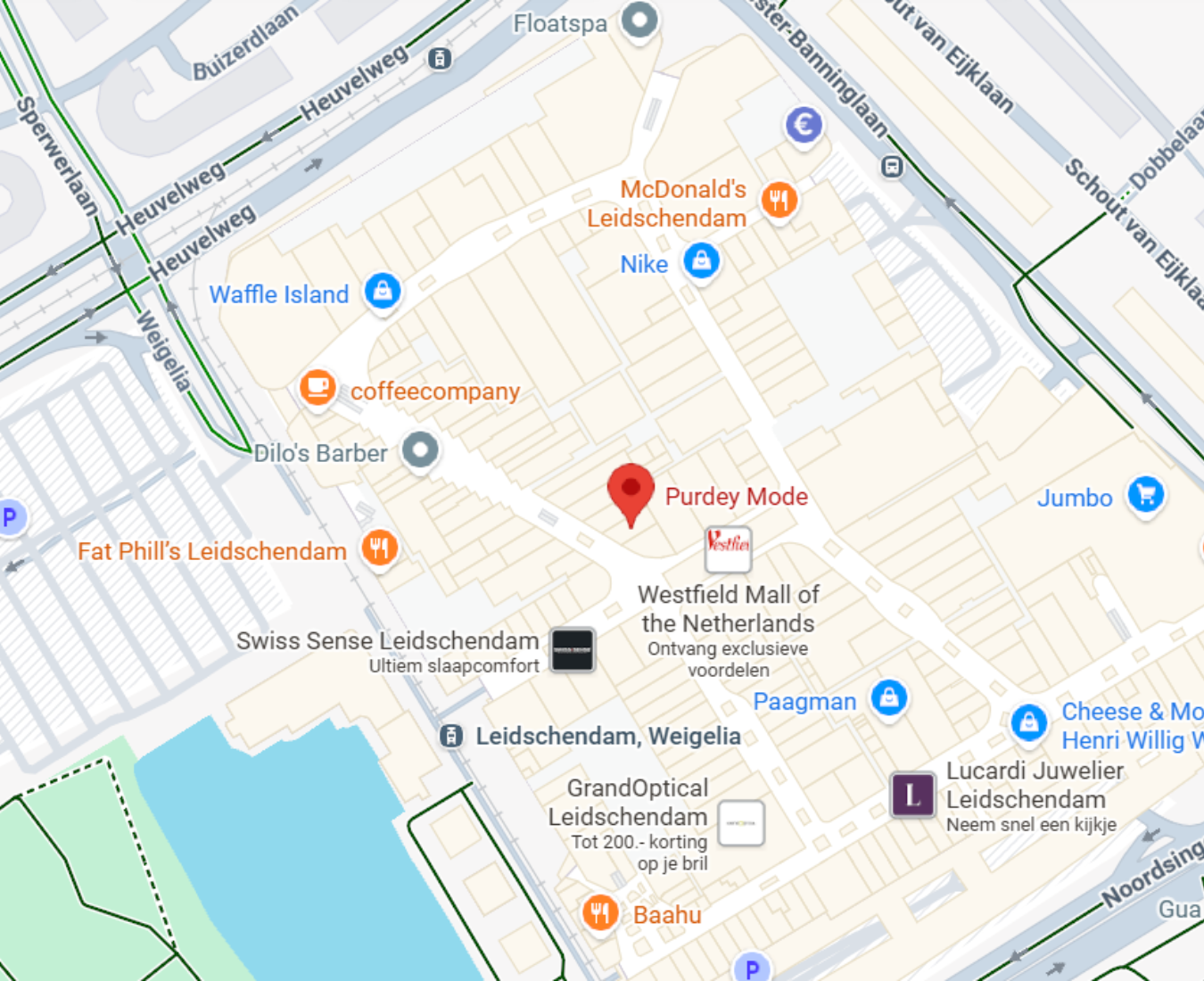 In The Mall of the Netherlands in Leidschendam vindt u Purdey, een winkel waar tijdloze elegantie en hedendaags comfort samenkomen. Dit moderne, overdekte winkelcentrum biedt een aangename en ontspannen winkelervaring, ongeacht het seizoen. Dankzij het gratis parkeren is uw bezoek aan Purdey bovendien extra comfortabel en toegankelijk.